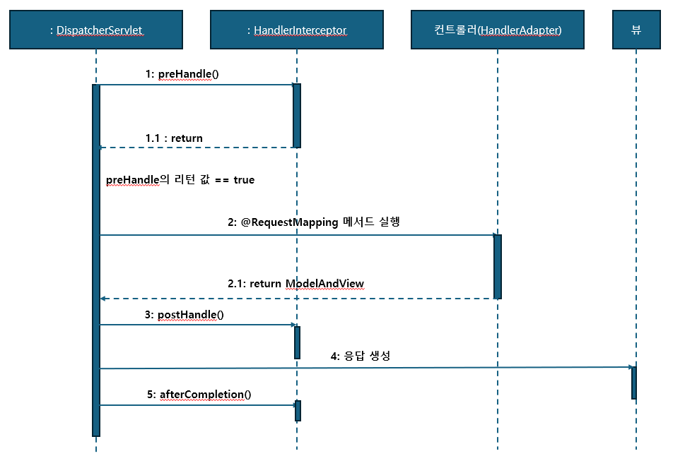 - HandlerInterceptor는 컨트롤러 실행 전/ 실행 후, 뷰 실행전 / 뷰 실행 후 와 같이 세 시점에 공통 기능을 넣을 수 있습니다.