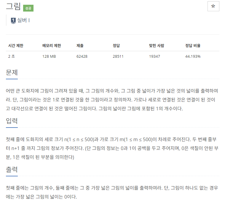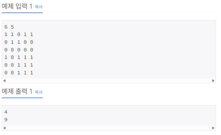 - 이 문제는 입력으로 주어진 0,1중 1이 연결된 그룹의 개수와 가장 많은 1이 연결된 그룹의 1의 개수가 몇 개인지 출력하는 문제입니다.
